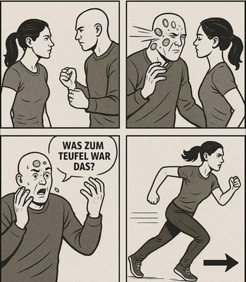 4. Der psychologische Effekt ist entscheidend: Das Ziel ist, beim Angreifer eine Art „Was zur Hölle war das?“-Moment zu erzeugen, sodass er nicht sofort reagieren kann.